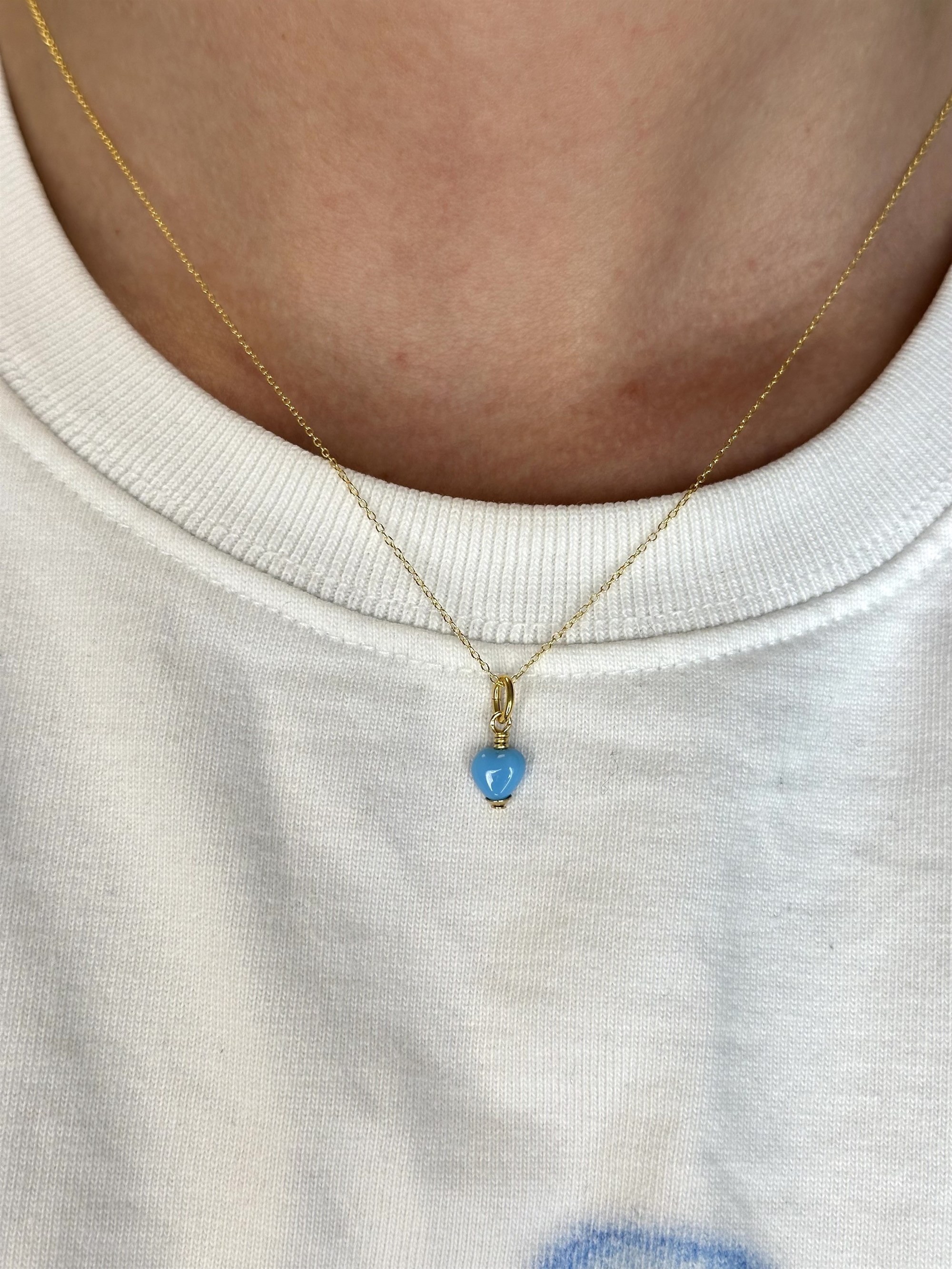 Sweetheart halskæden fra Pico er et fint og romantisk smykke med et lille hjertevedhæng i en smuk blå nuance. Halskæden er lavet i 24 karat forgyldt messing, som giver den varme guldtone, der passer perfekt til både hverdagsbrug og særlige lejligheder. Det lille blå hjerte måler 6 mm i bredden, hvilket gør det til en diskret, men alligevel iøjnefaldende detalje. Den enkle udformning gør halskæden utrolig nem at style – den kan bæres alene for et rent og feminint look eller kombineres med andre kæder i forskellige længder for et mere personligt udtryk.