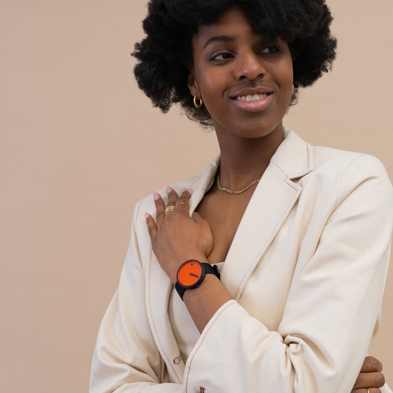 Den orange farve tilfører uret energi og synlighed. Orange forbindes ofte med kreativitet, handlekraft og optimisme. Det er en farve, der vækker opmærksomhed uden at være aggressiv, og som signalerer bevægelse og fremdrift. Sammen med sort opstår et balanceret udtryk, hvor den mørke rem dæmper og indrammer den stærke farve. Resultatet er et ur, der både er iøjnefaldende og kontrolleret i sit udtryk.