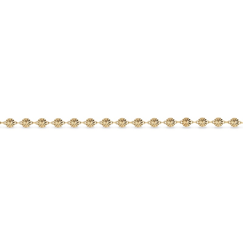Denne ankelkæde fra Scrouples er udført i forgyldt sølv og prydet med små, plisserede poletter, som ligger tæt og giver et smukt, ensartet udtryk. De fine poletter reflekterer lyset diskret og skaber et elegant spil, der giver smykket et feminint og eksklusivt look. Kæden måler 23 + 2 cm.