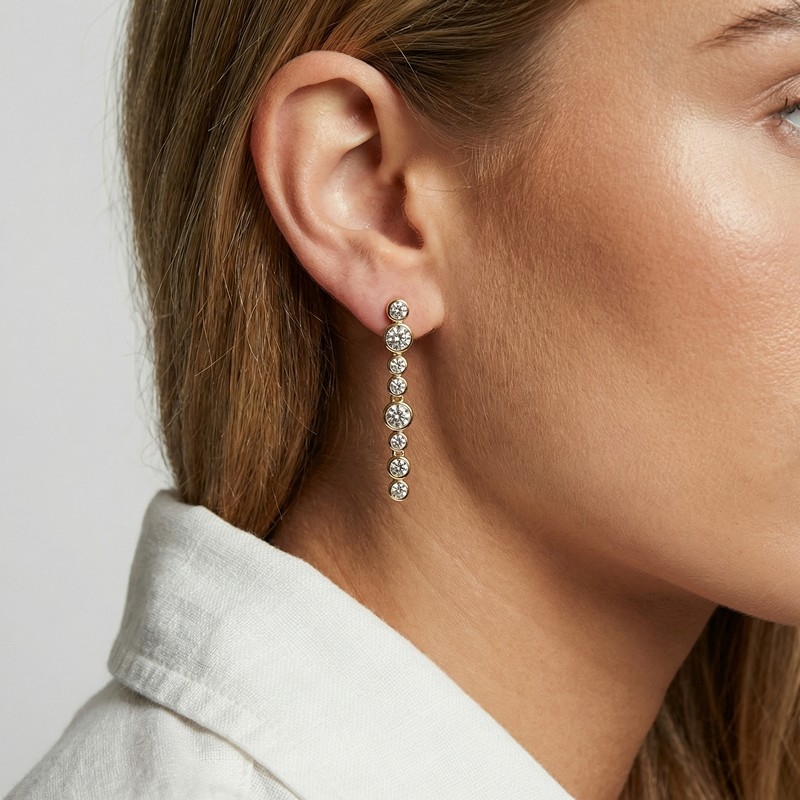 Øreringene er dekoreret med en række håndsatte facetslebne hvide zirkonia, som er placeret i forlængelse af hinanden i et slankt og harmonisk forløb. De klare sten reflekterer lyset smukt og skaber et levende spil, der giver øreringene et elegant og sofistikeret udtryk. Variationerne i stenstørrelser tilfører designet dybde og gør smykket ekstra interessant at se på.