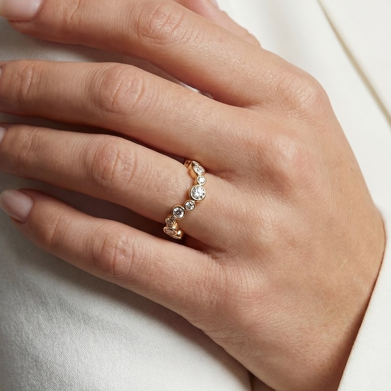 Langs ringens front er der håndsatte facetslebne hvide zirkonia i forskellige størrelser, som skaber et elegant spil af lys og giver ringen et raffineret udtryk. Den organiske form kombineret med de funklende sten giver ringen et flot samspil mellem det bløde og det iøjnefaldende.
