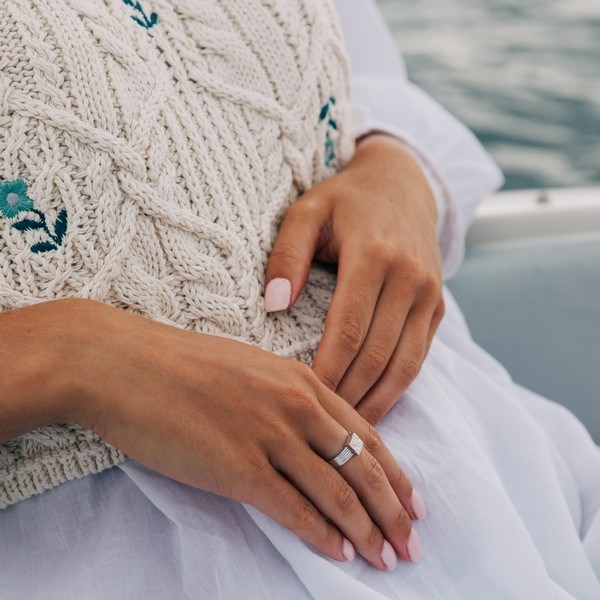 Ring i eksklusiv rhodineret sølv fra Simone Wulff x Izabel Camille collab kollektion. Den smukke ring Simone har skabt i samarbejde med Izabel Camille er slet ikke til at komme uden om. Ringen er lavet med et rillet bånd der sidder om fingeren, hvor på der sidder en firkant med et hamret mønster der illustrere havet.