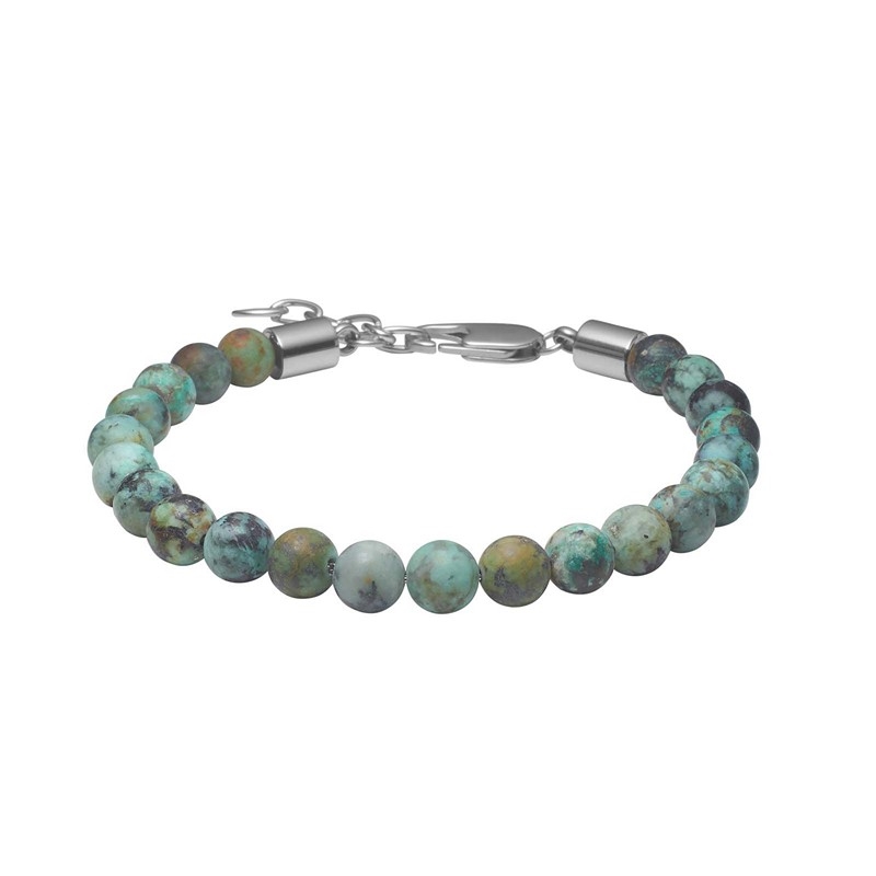 Armbåndet er afsluttet med lås og detaljer i rustfrit stål, som skaber en flot kontrast til de naturlige sten og understreger det maskuline design. Perlerne måler 6 mm.
