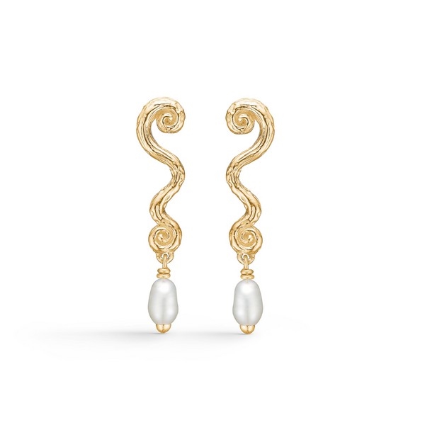 Wave øreringene i forgyldt sølv med de smukkeste dråbeformede kulturperler fra Studio Z. Øreringene har en smuk bølget form der sidder flot i ørene.