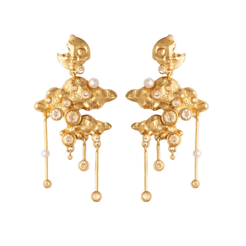 Cosmic Cascade øreringene fra House of Vincent er inspireret af nattens mystik, månens rolige tilstedeværelse og de funklende stjerner, der lyser op på himlen bag skyer der kommer drivende. Designet er skabt med flere bevægelige elementer, som giver øreringene et levende og dynamisk udtryk, hvor lyset hele tiden fanges på nye måder. Resultatet er et par markante statementøreringe, der virkelig tiltrækker opmærksomhed.