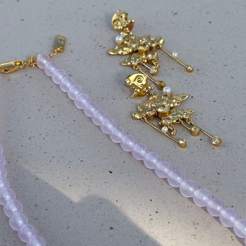 Øreringene er dekoreret med off-white nanokrystaller, der symboliserer stjernerne, mens de smukke hvide ferskvandsperler repræsenterer planeterne. I centrum troner månen som det naturlige midtpunkt og giver designet en poetisk og næsten eventyrlig karakter.