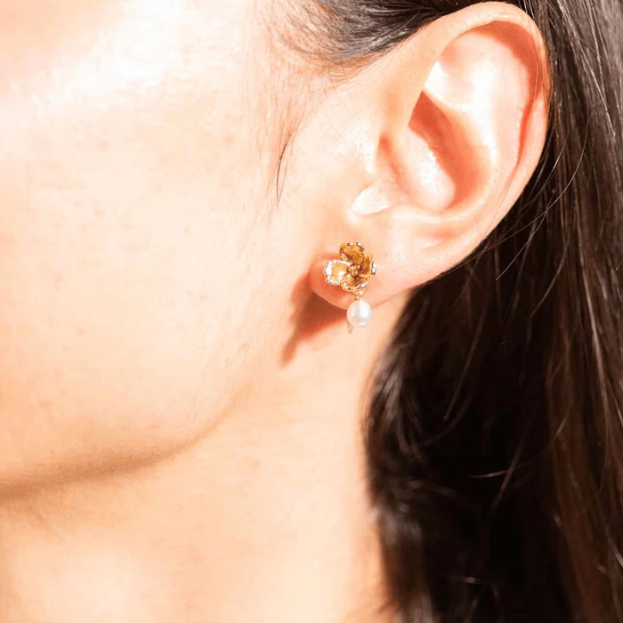 Venus Fleur Vide øreringene i forgyldt sølv fra House of Vincent er en hyldest til naturens organiske former og æstetikken i det uperfekte. I vinterkollektionen 2025 udforsker House of Vincent igen spændingsfeltet mellem det rå og det romantiske, hvor bløde linjer møder tekstur og struktur. Disse øreringe har en smuk, abstrakt blomsterform, hvor overfladen bevidst er gjort uregelmæssig for at skabe dybde, liv og karakter. Fra den skulpturelle top falder en naturlig ferskvandsperle, som tilfører et poetisk og feminint strejf og understreger smykkets sanselige udtryk.